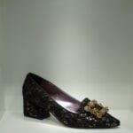 Barocke Pumps mit schrägem 5cm Blockabsatz und goldfarbener Spange